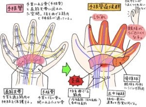 この“少し曲がった状態”を長時間続けると、血流が悪くなり腫れやすくなり、その腫れが神経をさらに圧迫し、しびれや痛みとして感じられるようになります。