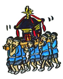 神輿を担ぐ時は、膝を軽く曲げて足の幅を肩幅くらいに開きます。