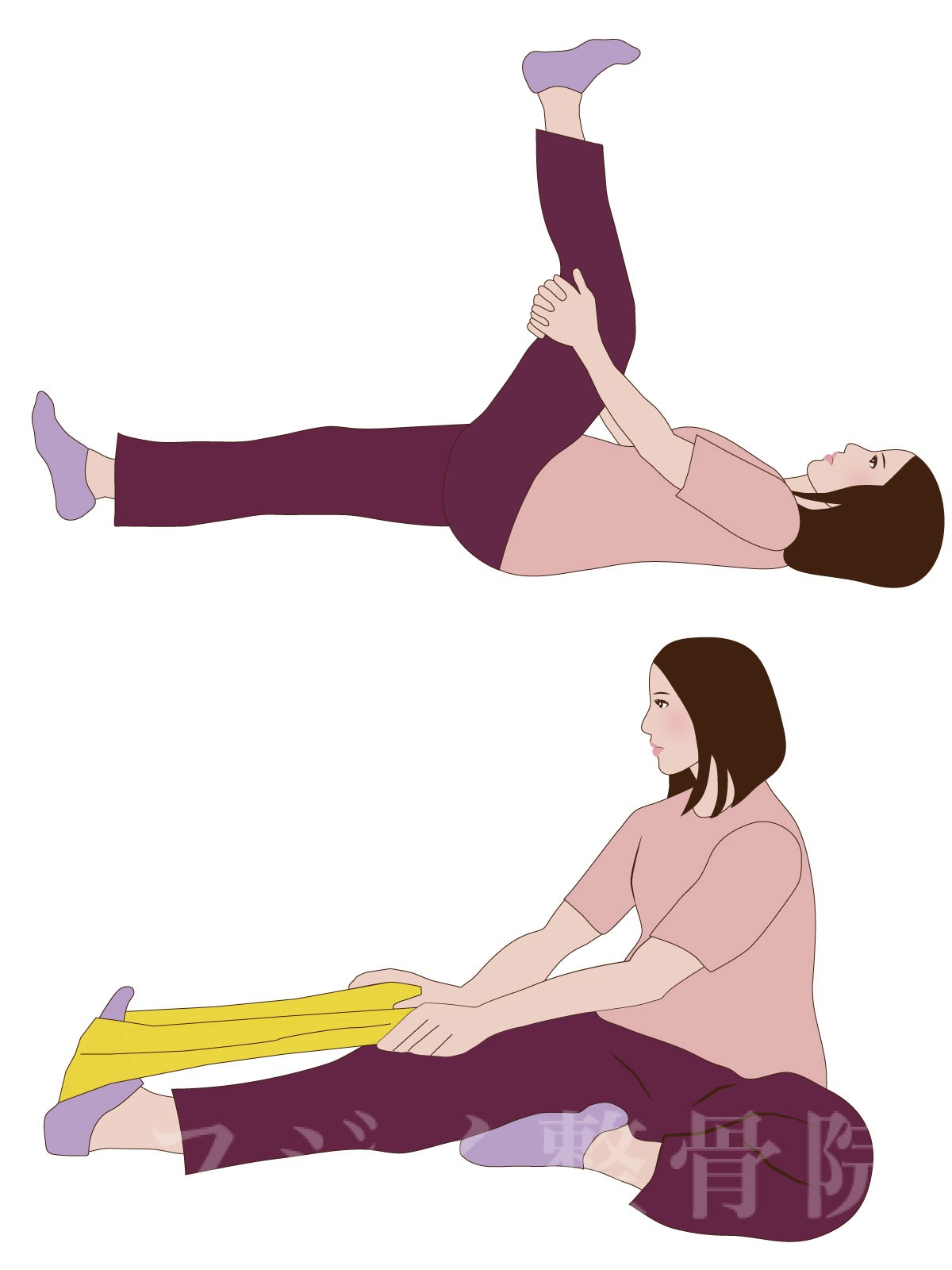 朝と夜に太ももの前後をゆっくり30秒ずつ伸ばすストレッチを行ってください。