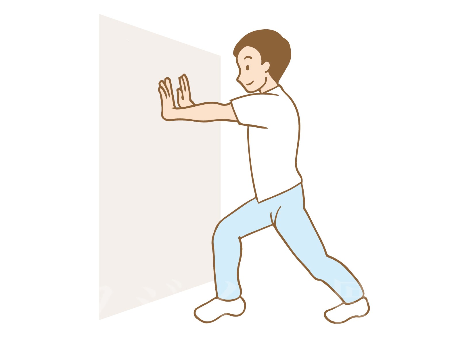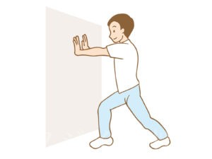 アキレス腱(ふくらはぎと踵をつなぐ腱)のストレッチは、壁に手をつき、後ろ足を伸ばした状態で20-30秒間保持します。