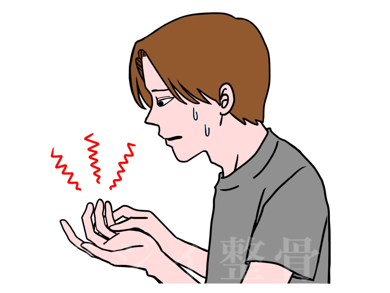 そのため、首の骨の歪みや、周囲の筋肉が硬くなって血流が悪くなることで、神経の流れが滞り、手の筋肉や腱に余分な緊張がかかることがあります。
