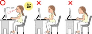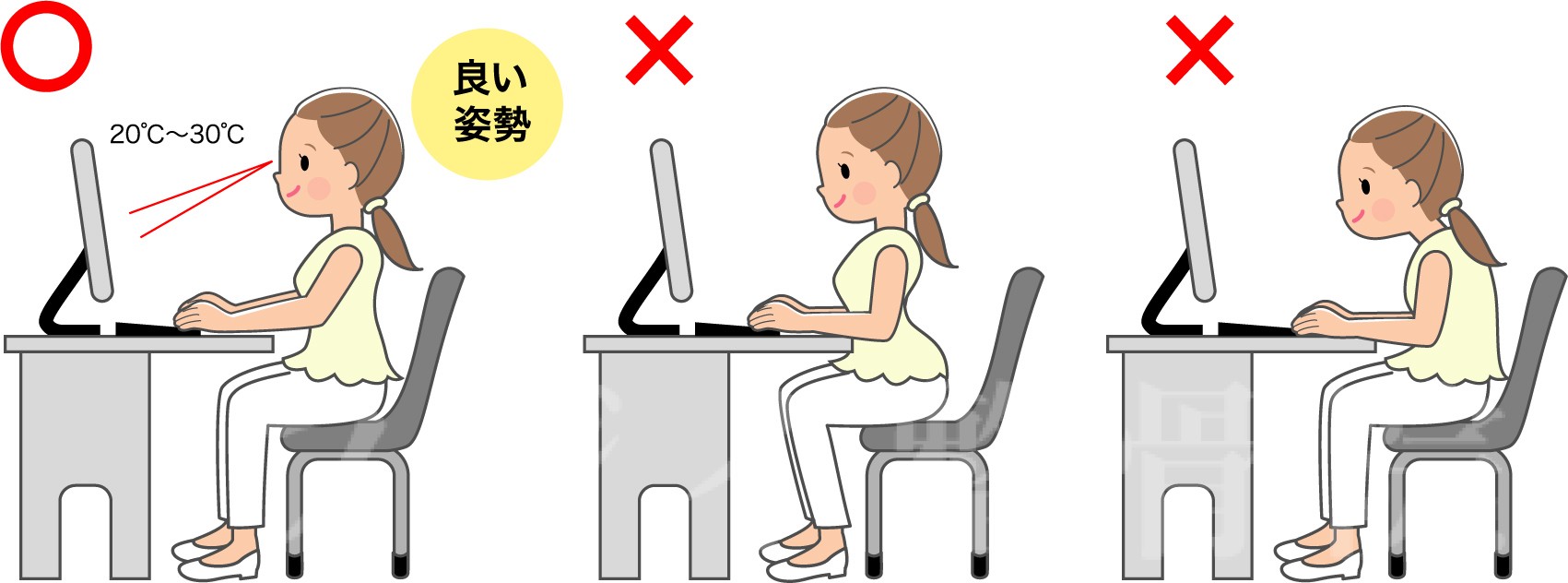 デスクワークの場合、モニターの高さが目線より低いと、首が前に出た姿勢になりやすくなります。