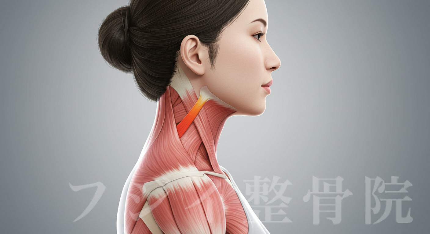 この筋肉は、長時間のデスクワークやスマートフォンの使用で首が前に出た姿勢を続けることで、常に引き伸ばされた状態になります。