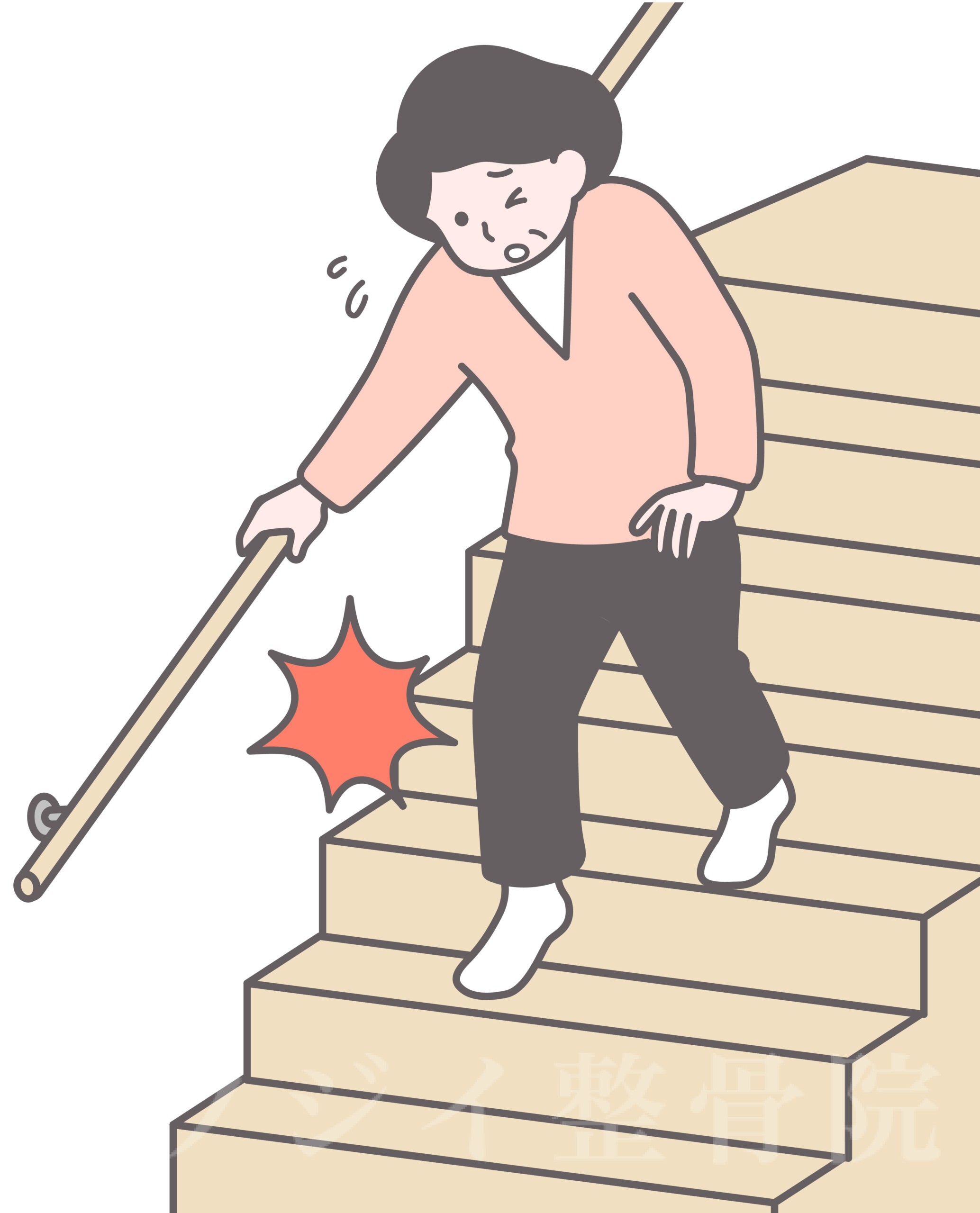 このねじれは、膝の内側や外側にある靭帯や半月板にストレスを与え、階段の「降りるとき」に強い痛みを感じる原因になります。