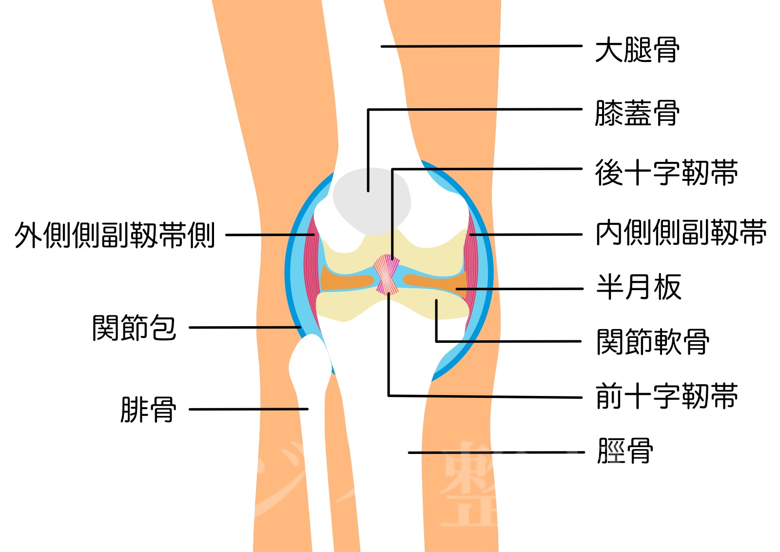 膝関節は、太ももの骨(大腿骨)とすねの骨(脛骨)で構成されています。