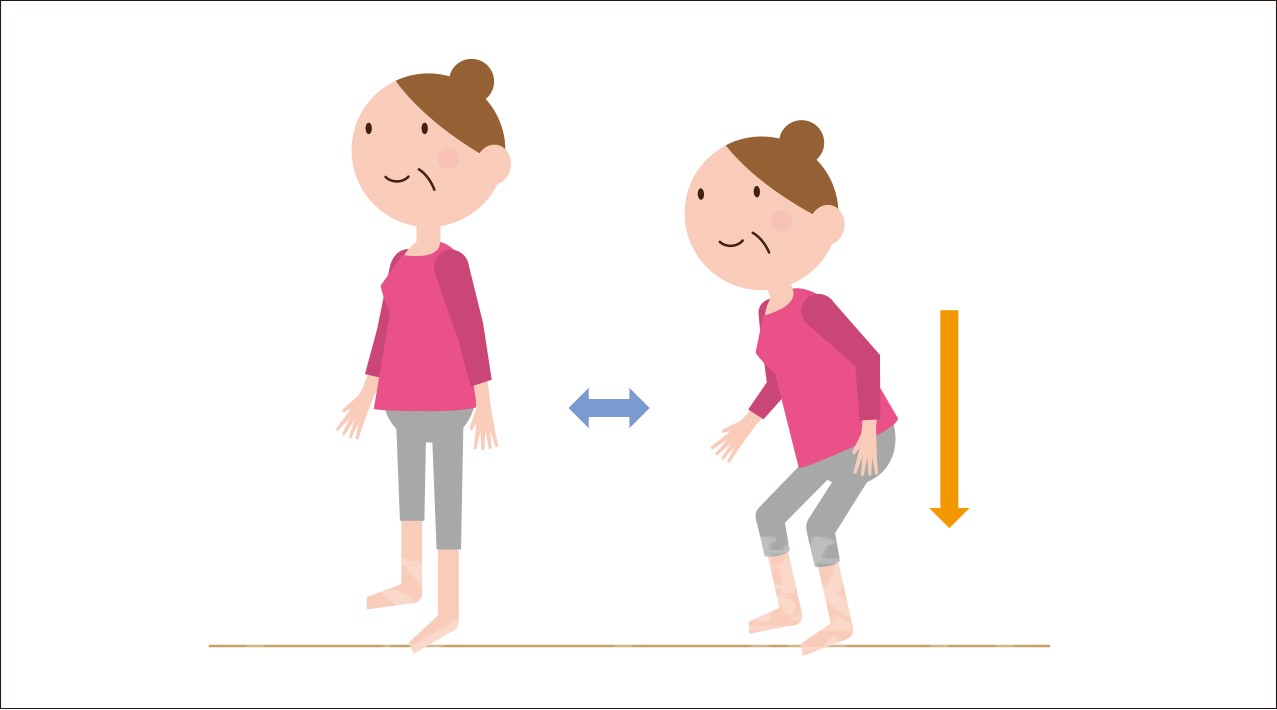 ③軽くしゃがんだとき、膝が内側や外側に流れていないか観察します。