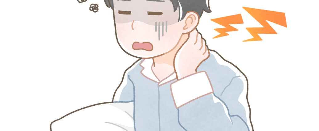 長時間この姿勢で過ごすことで、寝ている間にも筋肉が休まらず、朝起きたときに寝違えのような痛みを感じることがあります。